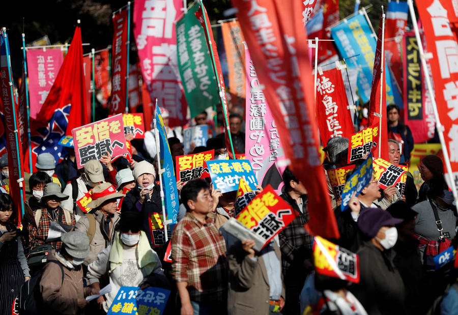 Las imágenes publicadas por Ruptly mostraron a los oficiales mirando mientras los manifestantes cantaban. Sus lemas anti-Abe sonaron en las calles de la capital japonesa.