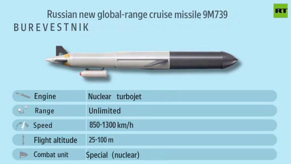 El Burevestnik es un misil de crucero estratégico de alcance ilimitado y propulsión nuclear diseñado para destruir objetivos de alto valor, incluidos búnkeres fortificados. Es indetectable por radar convencional y solo puede ser rastreado por naves espaciales especializadas durante las fases de lanzamiento y aceleración.